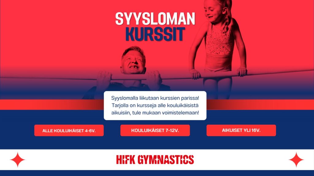 HIFK Gymnastics tarjoaa syyslomalla 14.-16.10. monipuolista ja hauskaa tekemistä kaikenikäisille. Tule mukaan liikkumaan, temppuilemaan ja nauttimaan syyslomasta yhdessä!