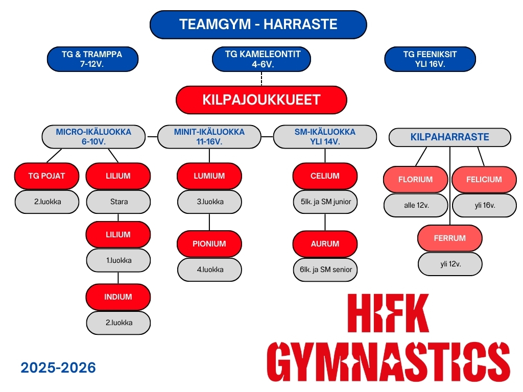 TeamGym-kilpapolussa joukkueet on jaettu ikäluokkiin: micro, minit sekä SM. Näiden lisäksi seurasta löytyy kilpaharrastelinja, jonka joukkueet ovat osa HIFK Gymnasticsin TeamGym-kilpapolkua.