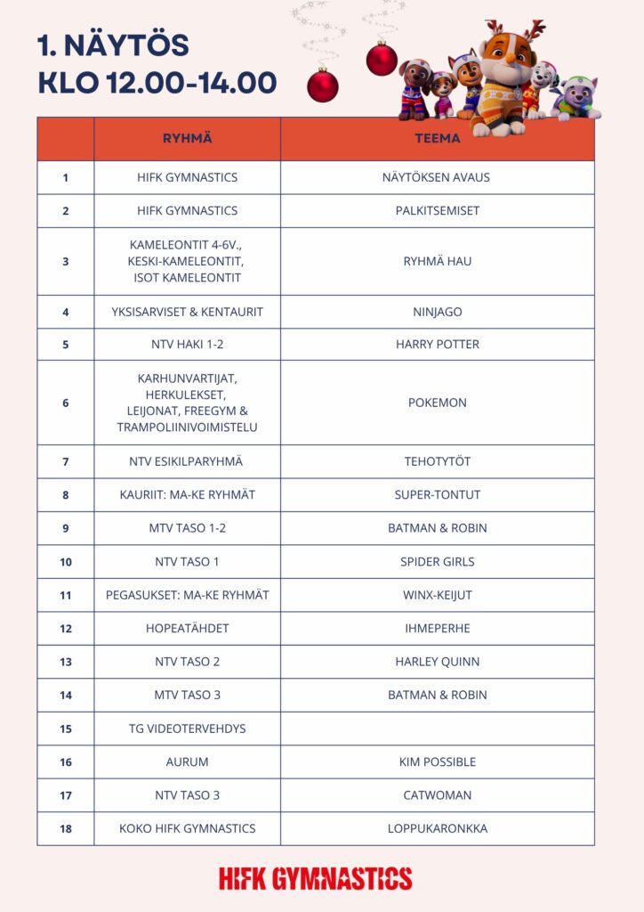 HIFK Gymnasticsin koko seuran joulunäytös järjestetään lauantaina 22.11.2025 Urhea-hallilla.