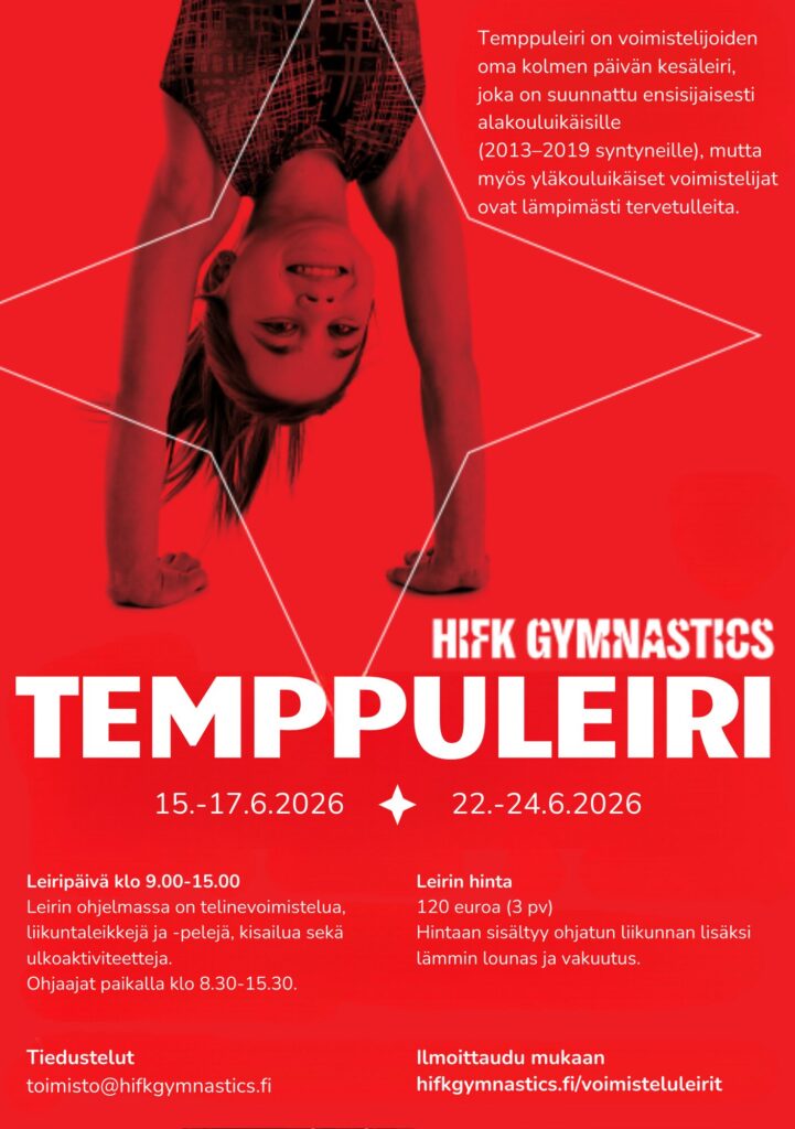 Jos ilmoittaudut molemmille Temppuleireille, saat ne yhteishintaan 220 €. Järjestelmä ei laske alennusta automaattisesti. Alennuksen saamiseksi, olethan yhteydessä toimistoon (toimisto@hifkgymnastics.fi) hyvissä ajoin ennen laskujen eräpäivää.
