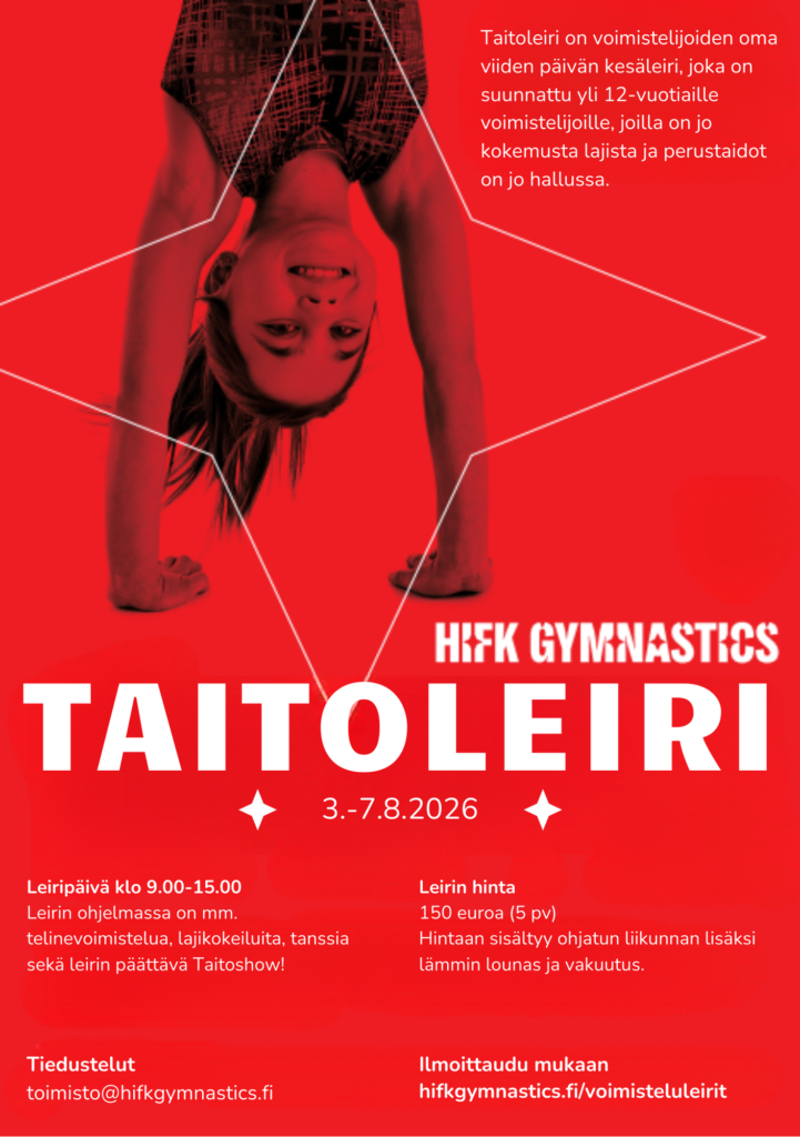 HIFK Gymnasticsin järjestämä voimisteluleiri on suunnattu ensisijaisesti alakouluikäisille (2013–2019 syntyneille), mutta myös yläkouluikäiset voimistelijat ovat lämpimästi tervetulleita. Leirit sopivat kaikille voimistelutempuista kiinnostuneille lapsille ja nuorille. Aikaisempaa kokemusta telinevoimistelusta ei tarvita. Lajiharjoittelussa otetaan huomioon ikä- & taitotaso.